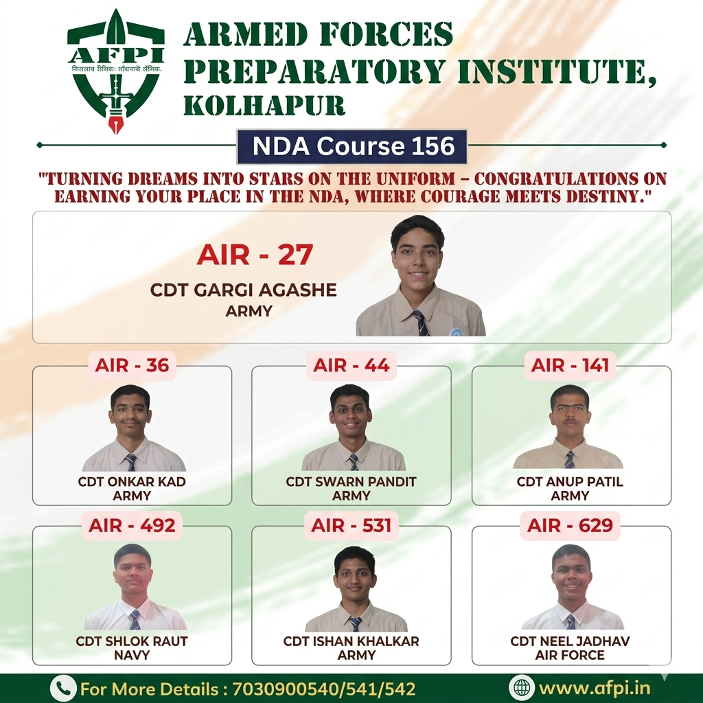 AFPI is a fully residential, NDA preparatory Institute, grooms boys and girls for their XIIth Board exams along with simultaneous training for NDA and other Armed Forces Entrance Exams and Services Selection Board (SSB) Interviews, which is mandatory for all types of officer entries.